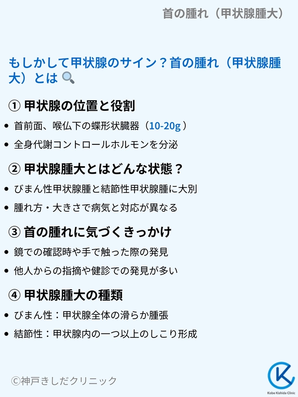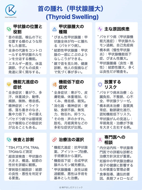 この記事では、首の腫れ(甲状腺腫大)の原因、伴う症状、検査方法、そして治療法について詳しく解説します。