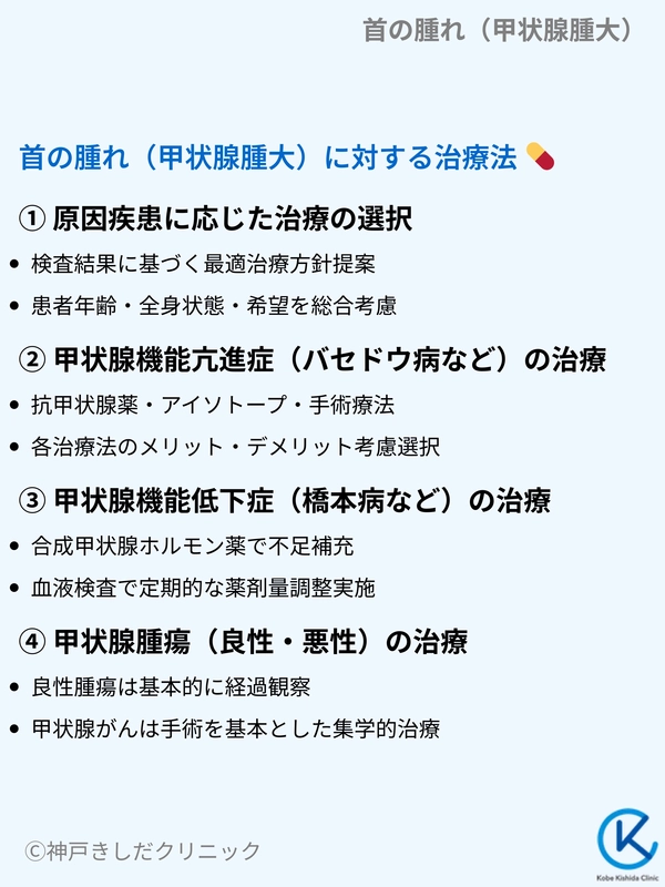 首の腫れ(甲状腺腫大)の治療は、その原因となっている病気の種類、甲状腺機能の状態、腫れの程度、患者さんの年齢や全身状態、希望などを総合的に考慮して決定します。
