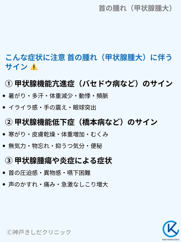 首の腫れに加えて、以下のような症状がある場合は、甲状腺の機能異常やその他の病気が隠れている可能性があります。