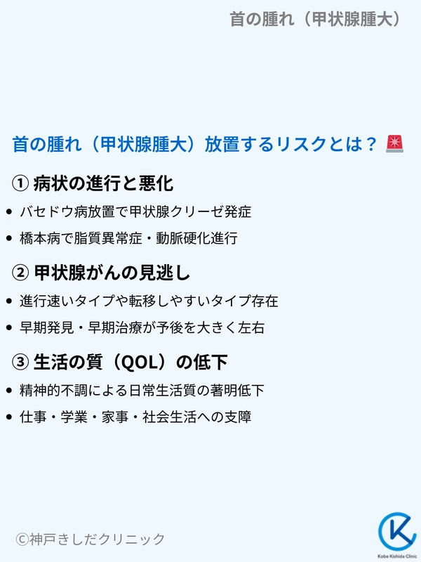 放置すると見た目の問題だけでなく、甲状腺機能の異常による全身症状や、稀に悪性腫瘍のリスクも心配されます。気になる症状がある方は、ぜひお早めにご相談ください。詳しくはこちら