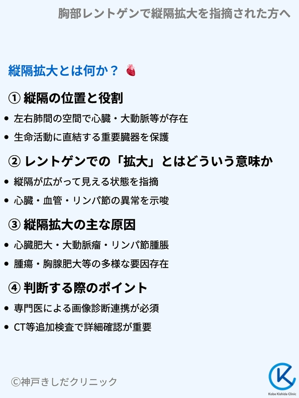 また、撮影角度や姿勢、肥満などが影響して一時的に縦隔が大きく見えていることもあるため、レントゲンだけで即断するのではなく、その後の追加検査が極めて重要になります。