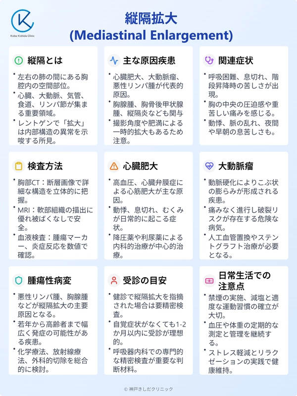 健康診断の結果で「縦隔拡大」という文字を目にすると、不安になってしまいますよね。ここでは縦隔拡大の概要や関連症状、考えられる疾患、そして受診の目安などを順を追って解説します。