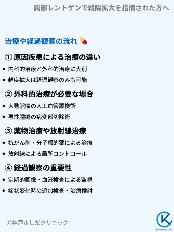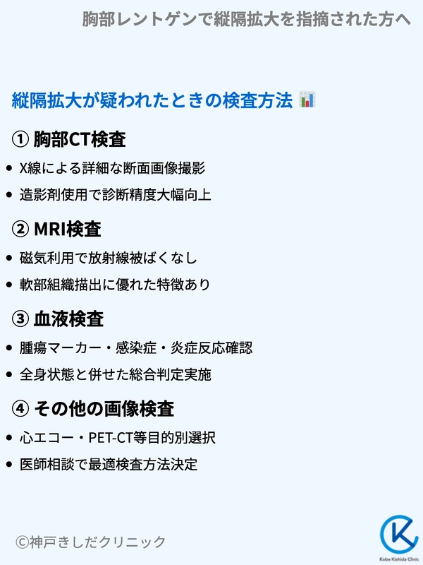 縦隔拡大の疑いがある場合は、CTなどの追加検査を実施して詳細を確認することが大切です。