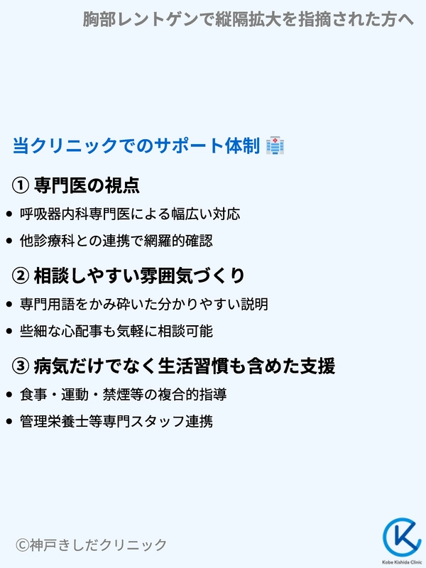 健康診断で縦隔拡大を指摘されるなど、胸部レントゲン異常で再検査や精密検査をご希望の方は、神戸きしだクリニックの呼吸器内科で対応させていただきます。詳しくはこちら