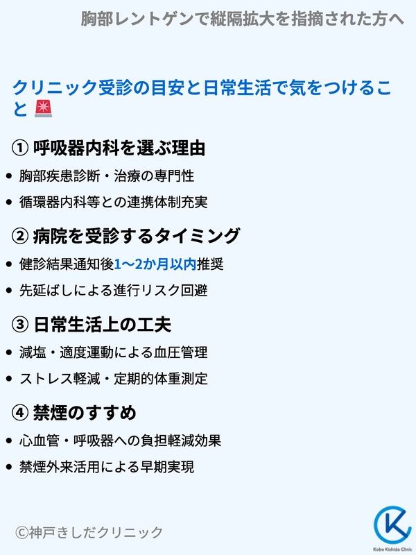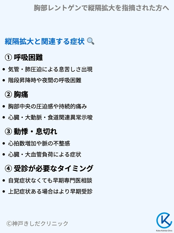 自覚症状の有無にかかわらず、健診で縦隔拡大の疑いを示された時点で、一度は専門医の意見を聞くことが重要です。症状がある方は、より早い受診が望ましいです。