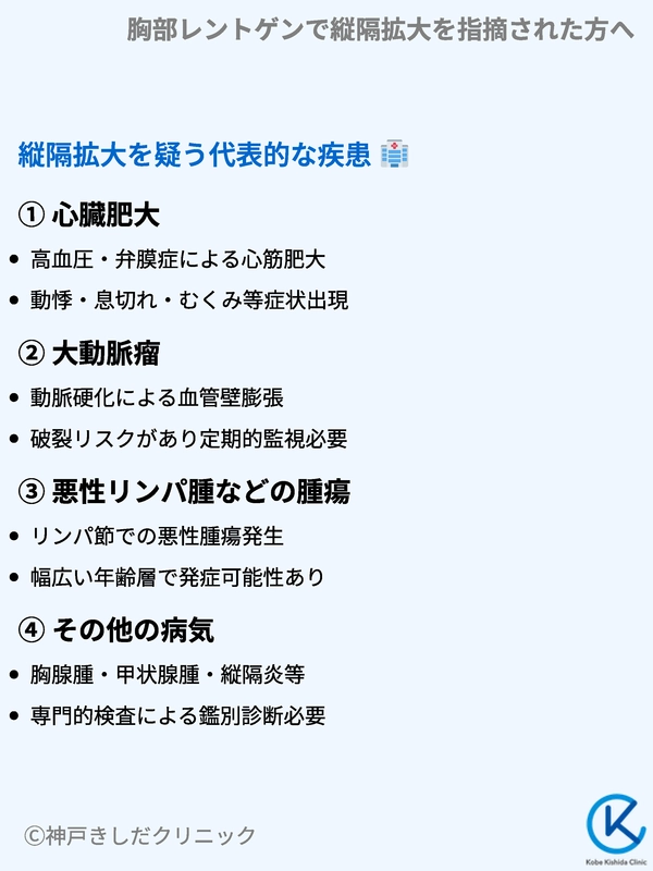 縦隔が広がったように見える原因には多様なものがあり、一概に「重大な病気」とは限りません。心臓肥大、大動脈瘤、リンパ節の腫脹、腫瘍の存在、胸腺の肥大などが代表的な例です。