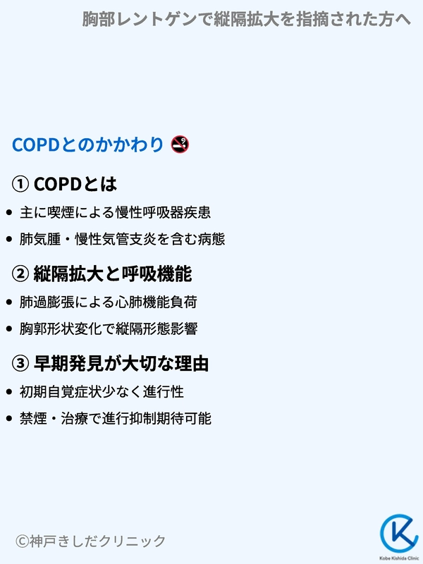 縦隔拡大とCOPD(慢性閉塞性肺疾患)は直接的な関係が明確にあるわけではありません。