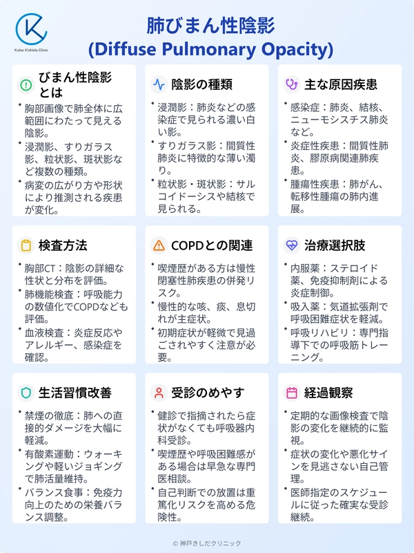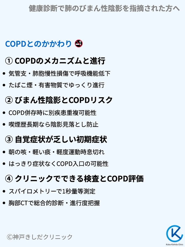 とくに喫煙歴やCOPDのリスクがある方は早めの受診を心がけると、将来的な合併症や進行を防ぐうえで役立ちます。