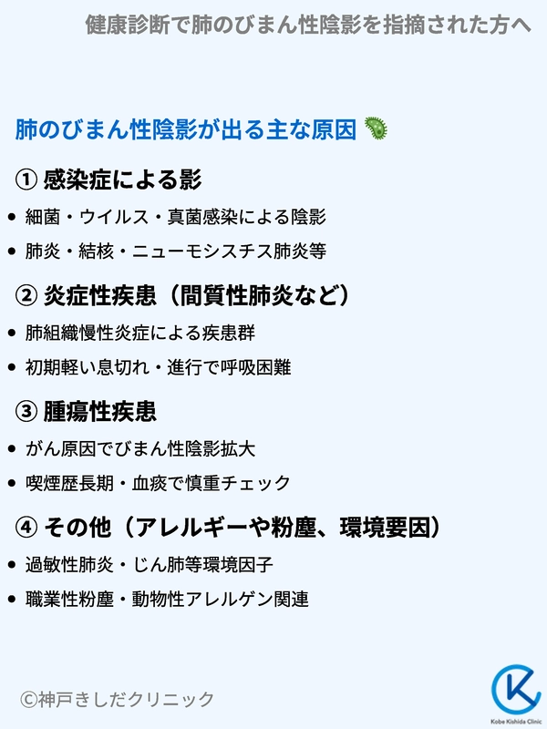 びまん性陰影は、「肺に広範囲な変化が見られる状態」を意味します。細かい粒のような影や、薄いすりガラス状の影など、複数のパターンがあります。