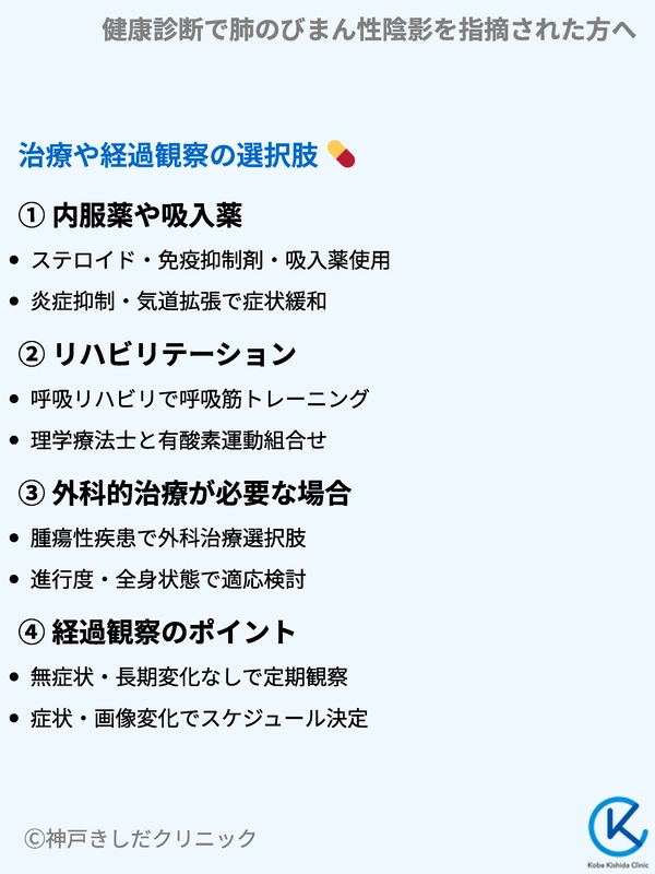 特に無症状で、陰影の変化が長期間認められない場合などは、定期的な画像検査で変化をチェックします。