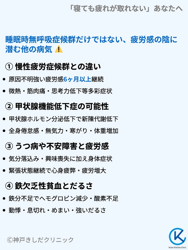主な疲労感 | 日中の強い眠気、熟睡感のなさ | 全身倦怠感、無気力感 |