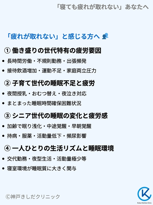 また、何らかの病気が背景にある場合も少なくありません。特に、睡眠の「量」だけでなく「質」が低下していると、いくら長く寝ても疲労は回復しにくいのです。