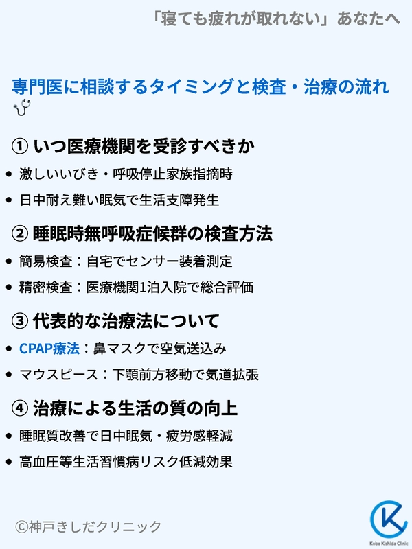 セルフケアを試みても「寝ても疲れが取れない」状態が改善しない場合や、いびきや睡眠中の呼吸停止を指摘された場合は、専門医に相談することを検討しましょう。