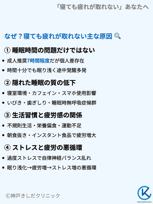 「しっかり寝ているはずなのに疲れが取れない」と感じる背景には、いくつかの要因が考えられます。