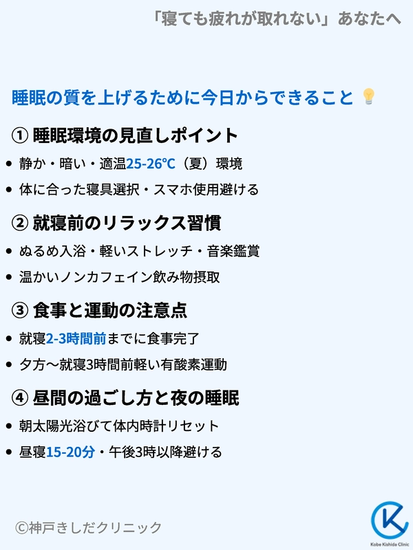 睡眠の質が低いとこれらの活動が十分に行われず、結果として日中の疲労感や体調不良につながります。