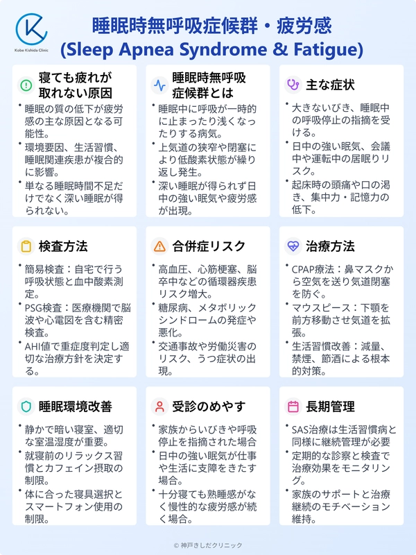 この記事では、そのつらい疲労感の原因を探り、特に睡眠時無呼吸症候群(SAS)との関連性や、質の高い睡眠を取り戻すための具体的な対策について詳しく解説します。