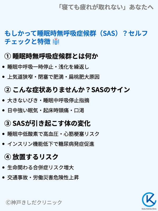 寝ても疲れが取れない、日中に強い眠気があるといった症状が続く場合、睡眠時無呼吸症候群(SAS: Sleep Apnea Syndrome)の可能性を考える必要があります。