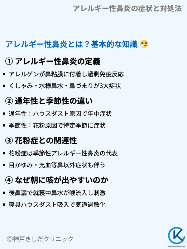 この記事では、アレルギー性鼻炎の基本的な知識から、症状の特徴、原因となる物質、ご自身でできる対策、そして医療機関での治療法まで、幅広く解説します。