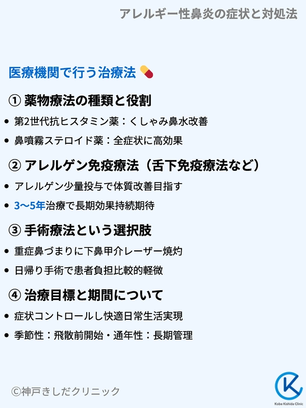 アレルギー性鼻炎の治療は、症状をコントロールし、快適な日常生活を送れるようにすることを目標とします。季節性の場合は花粉が飛散する少し前から治療を開始し、飛散期間中継続します。