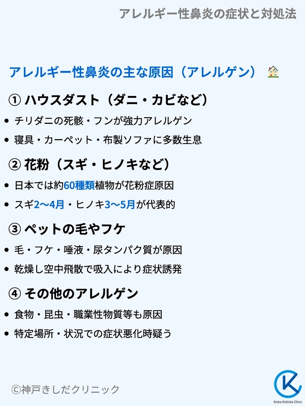 主な原因アレルゲン | ハウスダスト(ダニ、カビ、ペットの毛など) | 植物の花粉(スギ、ヒノキ、ブタクサなど) |