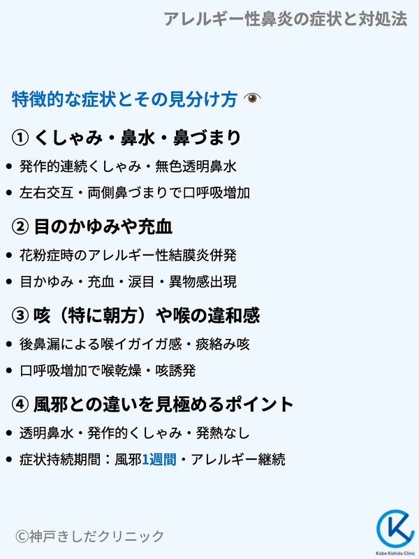 アレルギー性鼻炎の症状は、風邪の初期症状と似ているため、混同されがちです。しかし、いくつかのポイントに注意することで、両者を見分けることが可能です。