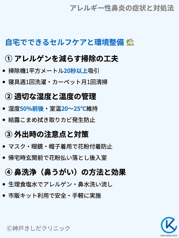 アレルギー性鼻炎の症状をコントロールするためには、医療機関での治療と並行して、日常生活でのセルフケアが非常に重要です。