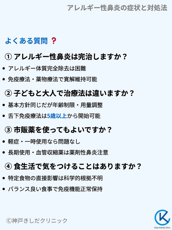 ここでは、アレルギー性鼻炎に関して患者さんからよく寄せられる質問とその回答をまとめました。
