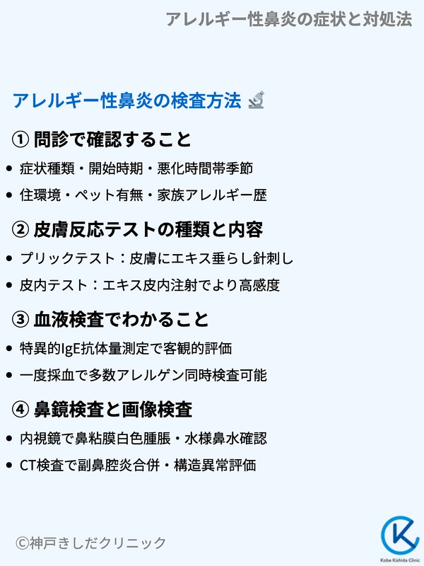 症状からアレルギー性鼻炎が疑われる場合、医療機関では原因アレルゲンを特定するための検査を行います。原因を正確に突き止めることで、より効果的な治療や対策が可能になります。