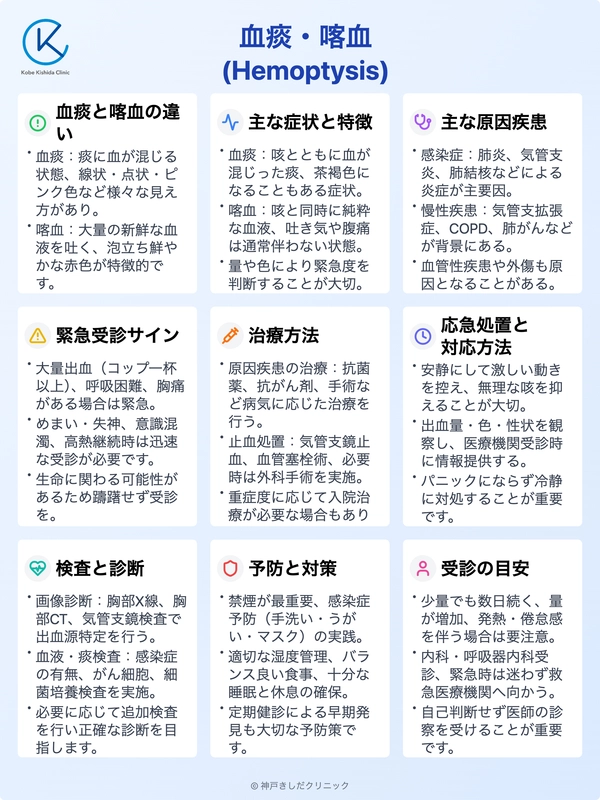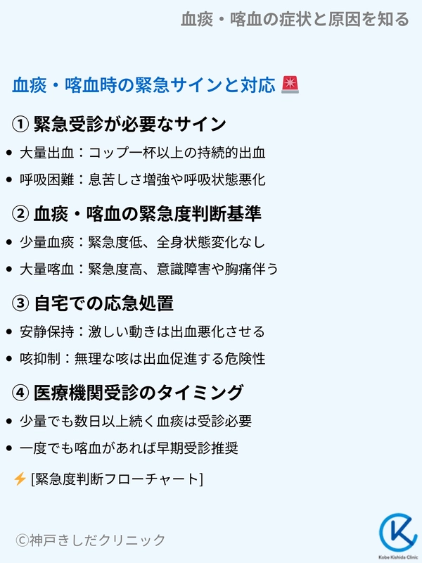 血痰や喀血があった場合、緊急サインが見られない場合でも、できるだけ早く内科や呼吸器内科を受診することが重要です。