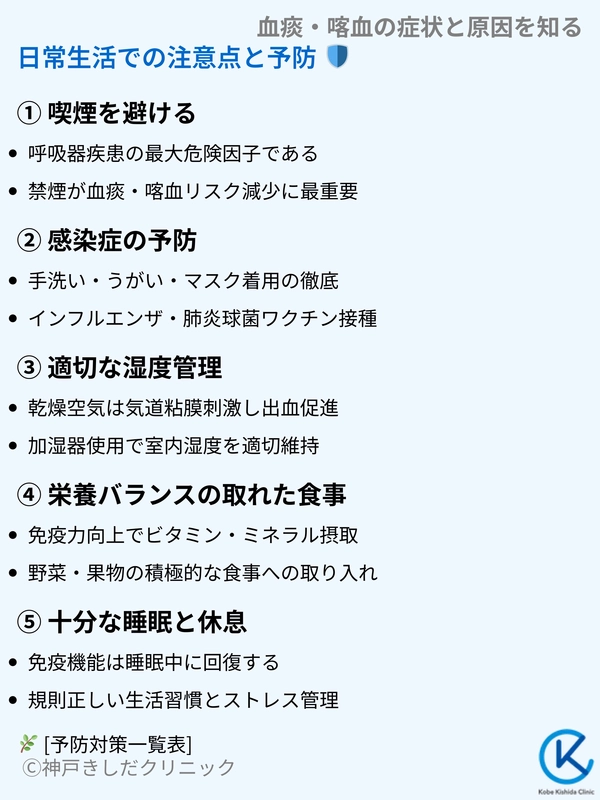 血痰や喀血は、一度症状が出ると不安なものですが、原因を治療するとともに、日常生活での注意点を守り、予防を心がけることが大切です。