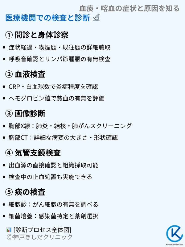 血痰や喀血の原因を特定するために、医療機関では様々な検査が行われます。これらの検査によって、病気の正確な診断に繋がります。