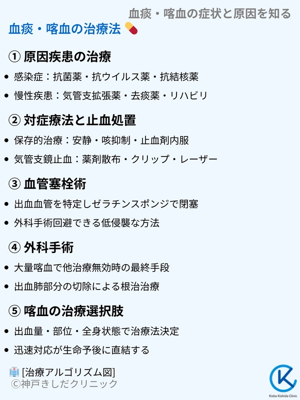 血痰や喀血の治療は、その原因となっている病気の種類や重症度によって異なります。早期に原因を特定し、適切な治療を開始することが、症状の改善と病気の進行を防ぐために重要です。