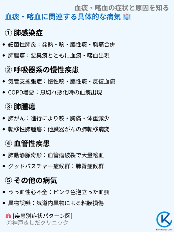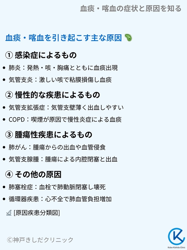 慢性疾患 | 気管支拡張症、COPDなど | 慢性的な咳、痰、息切れ、血痰/喀血 |