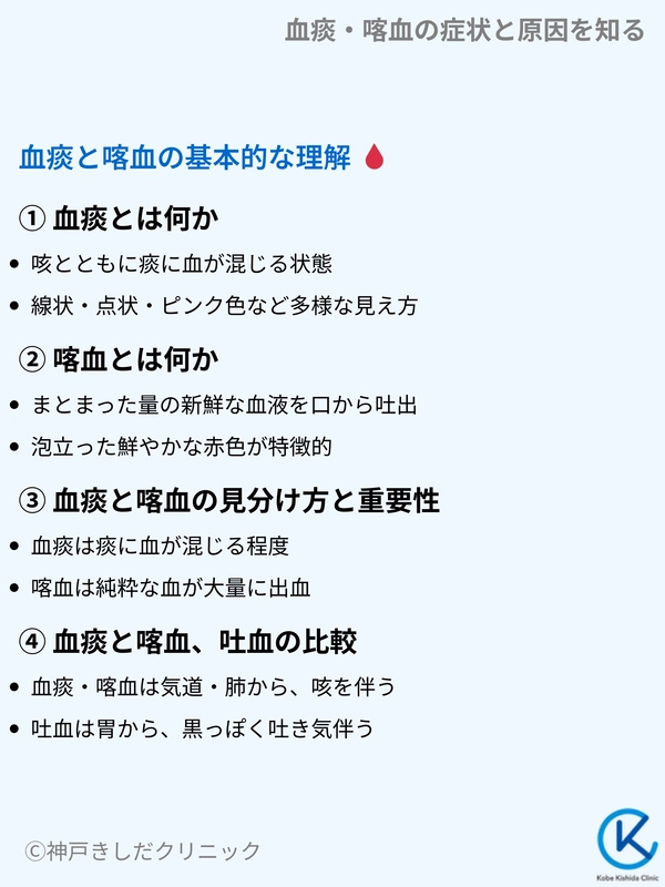 血痰と喀血はどちらも口から血が出る症状ですが、その性質や緊急性は異なります。これらの違いを理解することは、適切な対応を取る上で非常に重要です。
