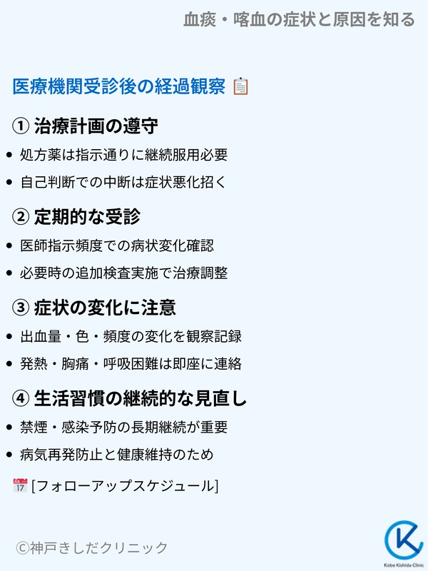 血痰や喀血で医療機関を受診し、診断と治療が開始された後も、医師の指示に従い、適切な経過観察を行うことが大切です。