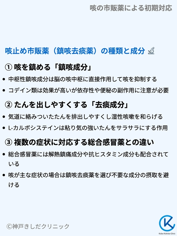 多くの市販薬には、鎮咳成分と去痰成分が両方配合されています。ただし、たんの多い湿った咳の場合、強い鎮咳成分で無理に咳を止めると、気道にたんが溜まりやすくなることがあります。