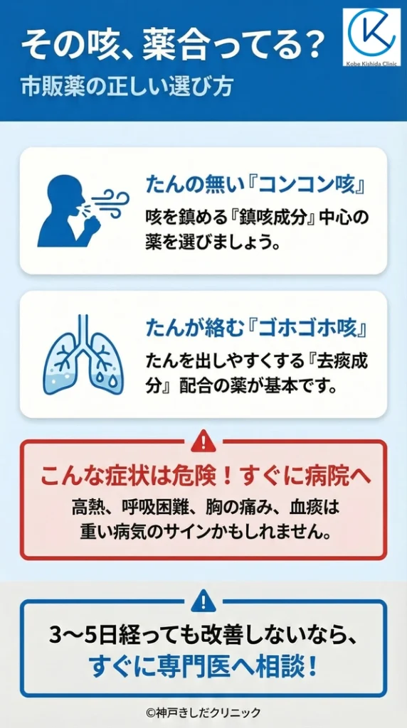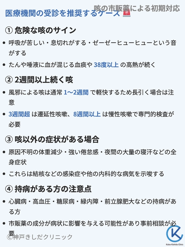 一方で、市販薬での対応が適さない、あるいは注意が必要な咳もあります。自身の咳がどちらに近いかを見極めることが重要です。