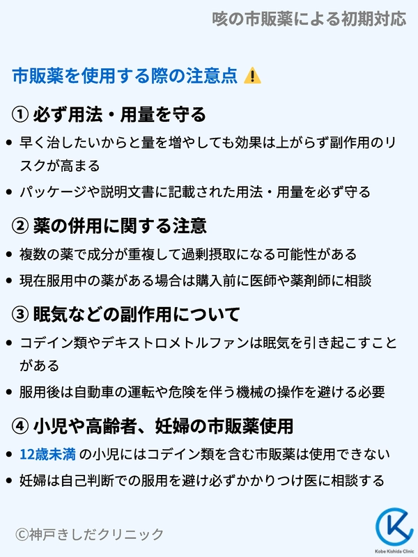 特に総合感冒薬、アレルギー用の鼻炎薬、解熱鎮痛薬などには、咳止めと同じ成分が含まれていることがあるため注意が必要です。現在服用中の薬がある場合は、購入前に必ず医師や薬剤師に相談してください。