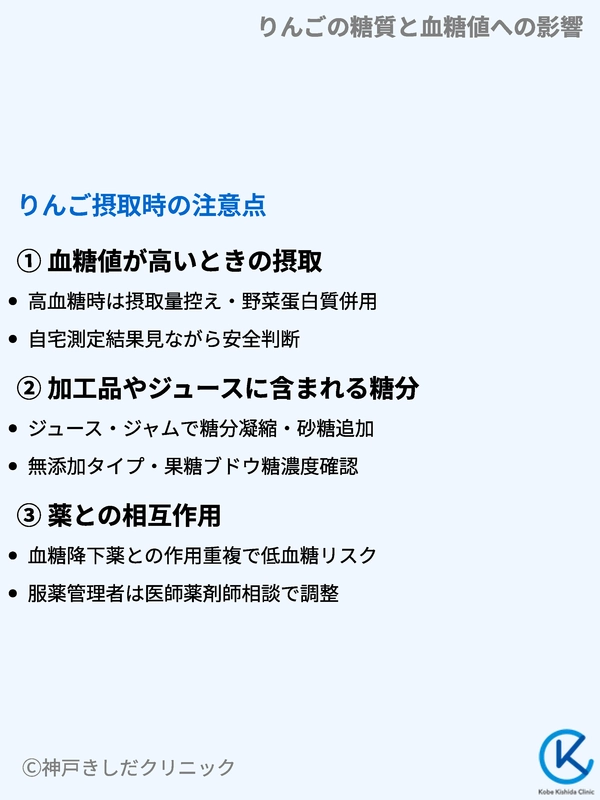 糖尿病治療薬の中には血糖値を下げる作用が強いものがあり、りんごを食べたタイミングと薬の作用が重なると低血糖のリスクが高まる場合があります。