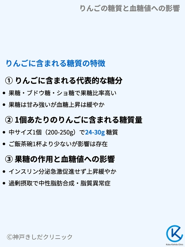 りんごから摂った糖質はブドウ糖と果糖の両方が含まれ、ブドウ糖は血糖値を即座に上げやすく、果糖はゆるやかに影響するという特徴があります。