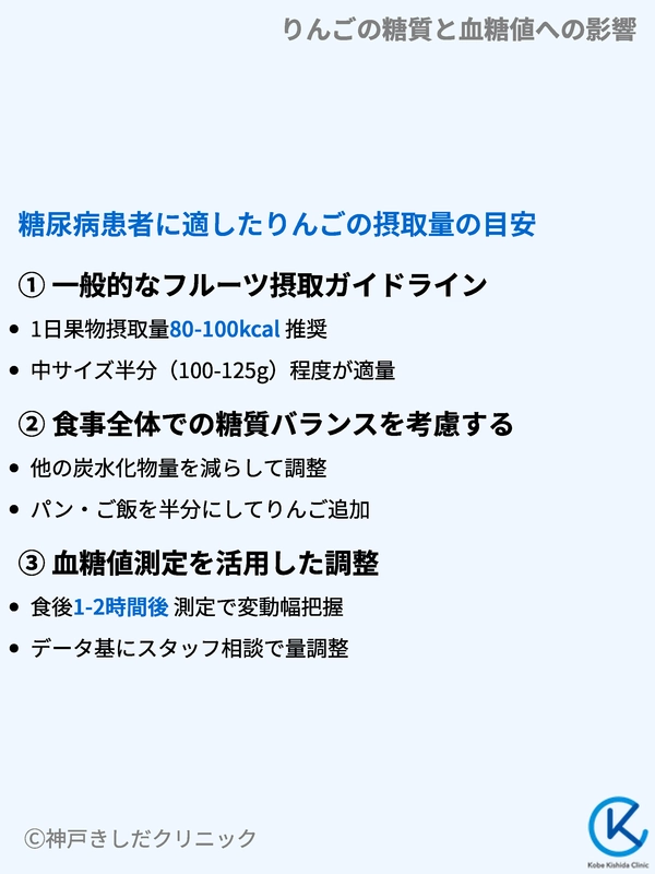 りんごを食べるなら、それ以外の炭水化物(ご飯やパンなど)の量をやや減らして調整すると血糖値が安定しやすくなります。