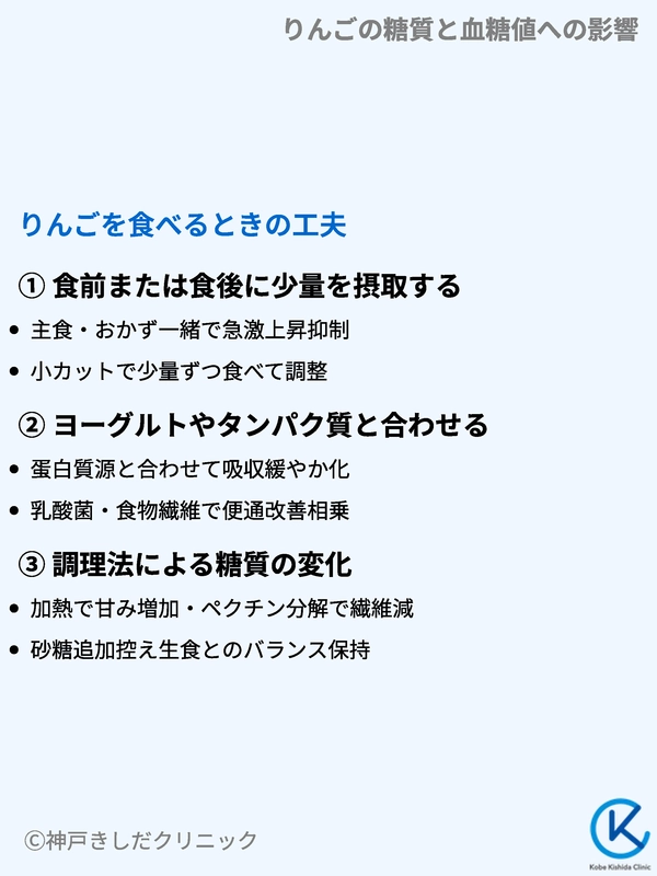 りんごを食べるときに血糖値を緩やかに保ちたいときはいくつかの工夫が有効です。