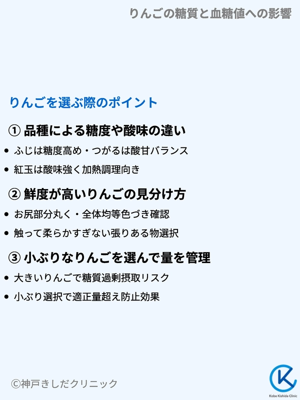 糖尿病の方がりんごを選ぶときは糖度だけでなく品種や鮮度にも目を向けると血糖値コントロールがしやすくなります。
