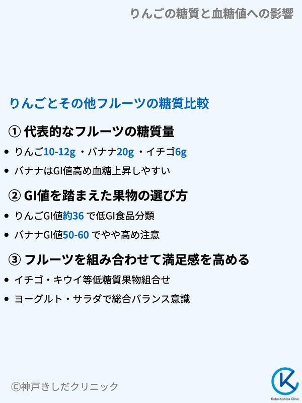 りんごだけでなくイチゴやキウイ、柑橘類など糖質量やGI値が比較的低いフルーツを組み合わせると、彩りや味わいの面でも満足感を得やすくなります。