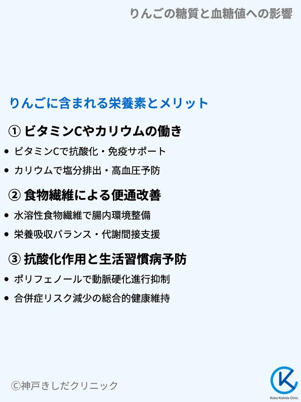 そのため、りんごは糖質が含まれていても血糖値上昇を一定程度抑える可能性があります。