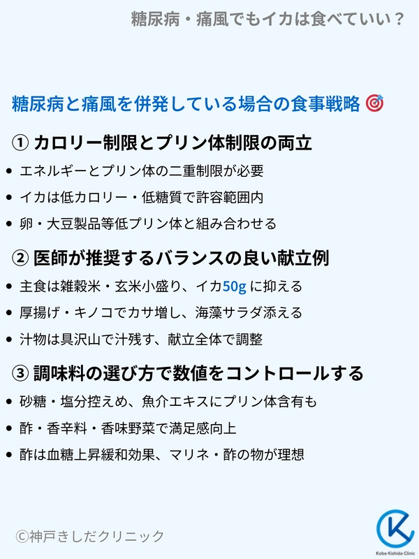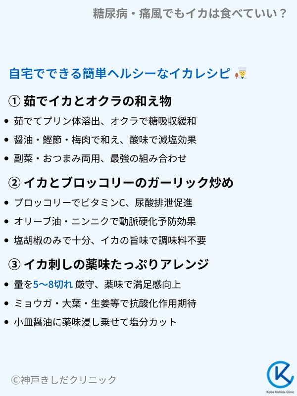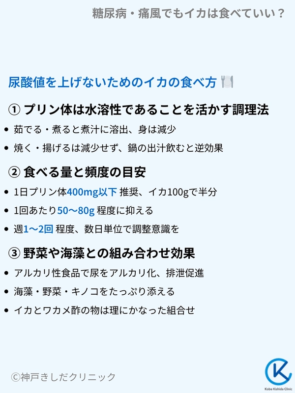 また、毎日連続して食べるのではなく週に1〜2回程度に頻度を抑え、他の食事とのバランスを考えることも大切です。今日はイカを食べたから明日はプリン体の少ない卵料理にするなど、数日単位で調整する意識を持ちましょう。