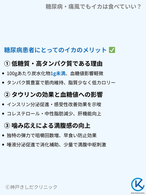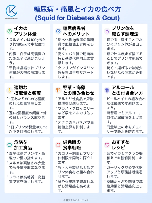 イカは糖質が極めて少なく、血糖値を気にする方には非常に優秀な食材ですが、痛風や高尿酸血症を併発している場合には注意が必要です。イカのプリン体含有量は中程度からやや多めに分類されるため、無制限に食べてよいわけではありません。