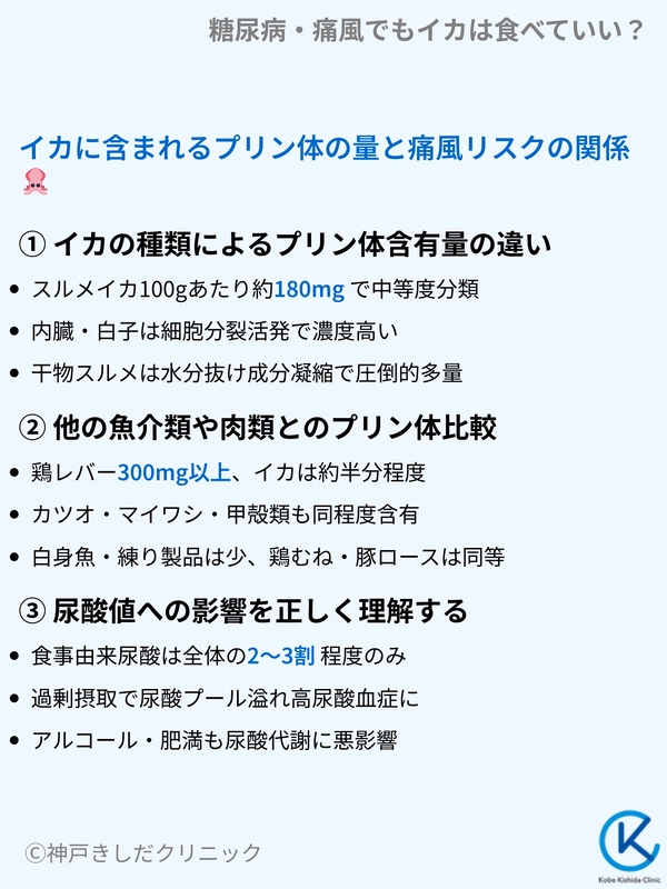 だからといって食事制限に意味がないわけではなく、過剰な摂取は尿酸プールを溢れさせ、高尿酸血症のリスクを高めます。特にイカのような美味しい食材はつい食べ過ぎてしまう傾向があり、それが結果として尿酸値の上昇を招く原因となるのです。