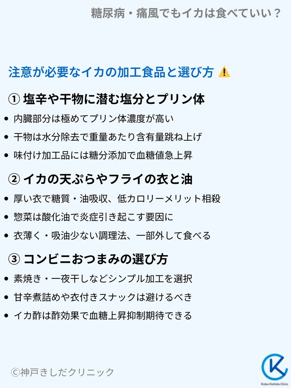 イカの加工食品は生のイカと比較して塩分や添加物が多く、プリン体が凝縮されている場合があります。糖尿病や痛風の方が選ぶ際には成分表示の確認と摂取量の厳格な管理が必要であり、手軽さの裏にあるリスクを理解しなければなりません。