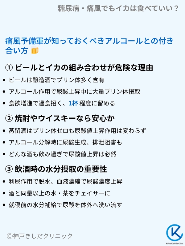 イカを食べる場面ではお酒が付き物ですが、アルコール自体が尿酸値を上昇させる作用を持つため組み合わせには細心の注意が必要です。アルコールは尿酸の産生を増やしつつ排泄を阻害するというダブルパンチの効果を持ち、発作のリスクを高めます。